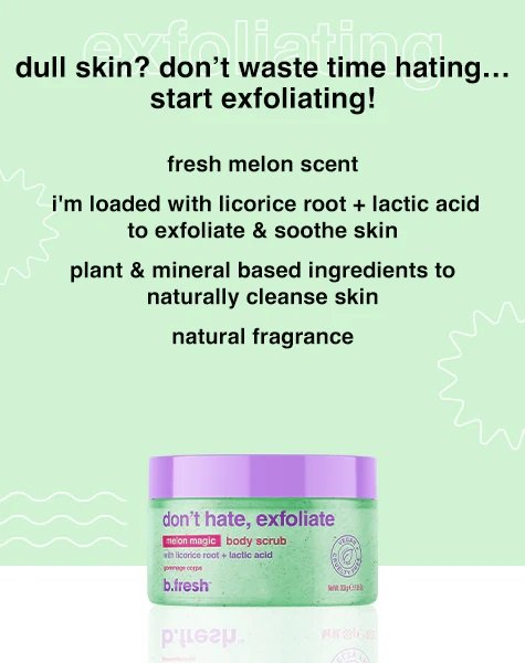 Θαμπό δέρμα; Μη χάνεις χρόνο να μισείς τα θαμπά, νεκρά κύτταρα του δέρματός σου, ξεκίνα την απολέπιση! Το γαλακτικό οξύ λειαίνει απαλά + ενυδατώνει την επιδερμίδα διεγείροντας την παραγωγή φυσικού υαλουρονικού οξέος και κεραμιδίου, ενώ η γλυκόριζας βοηθά στη λάμψη + την τόνωση. Το πλούσιο άρωμα πεπονιού θα σας αφήσει να μυρίζετε και να αισθάνεστε δροσερή και φρέσκια. Θα το αγαπήσεις γιατί: Είναι γεμάτο με ρίζα γλυκόριζας + γαλακτικό οξύ για απαλή απολέπιση και καταπραϋντική δράση. Έχει υπέροχο άρωμα φρέσκου πεπονιού. Paraben free. aluminum free. alcohol free. cruelty free.