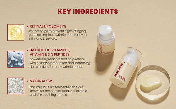 Ρετινάλη, Ζύμωμα ρυζιού, Bakuchiol, Βιταμίνη C, Βιταμίνη E και 3 τύπους πεπτιδίων